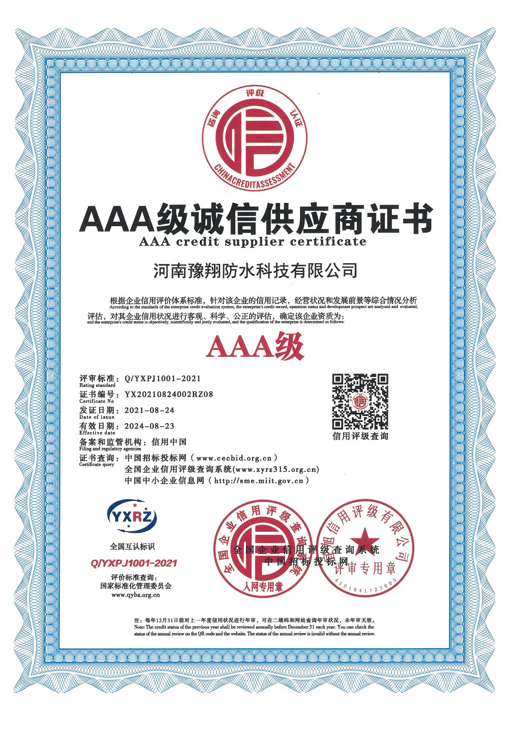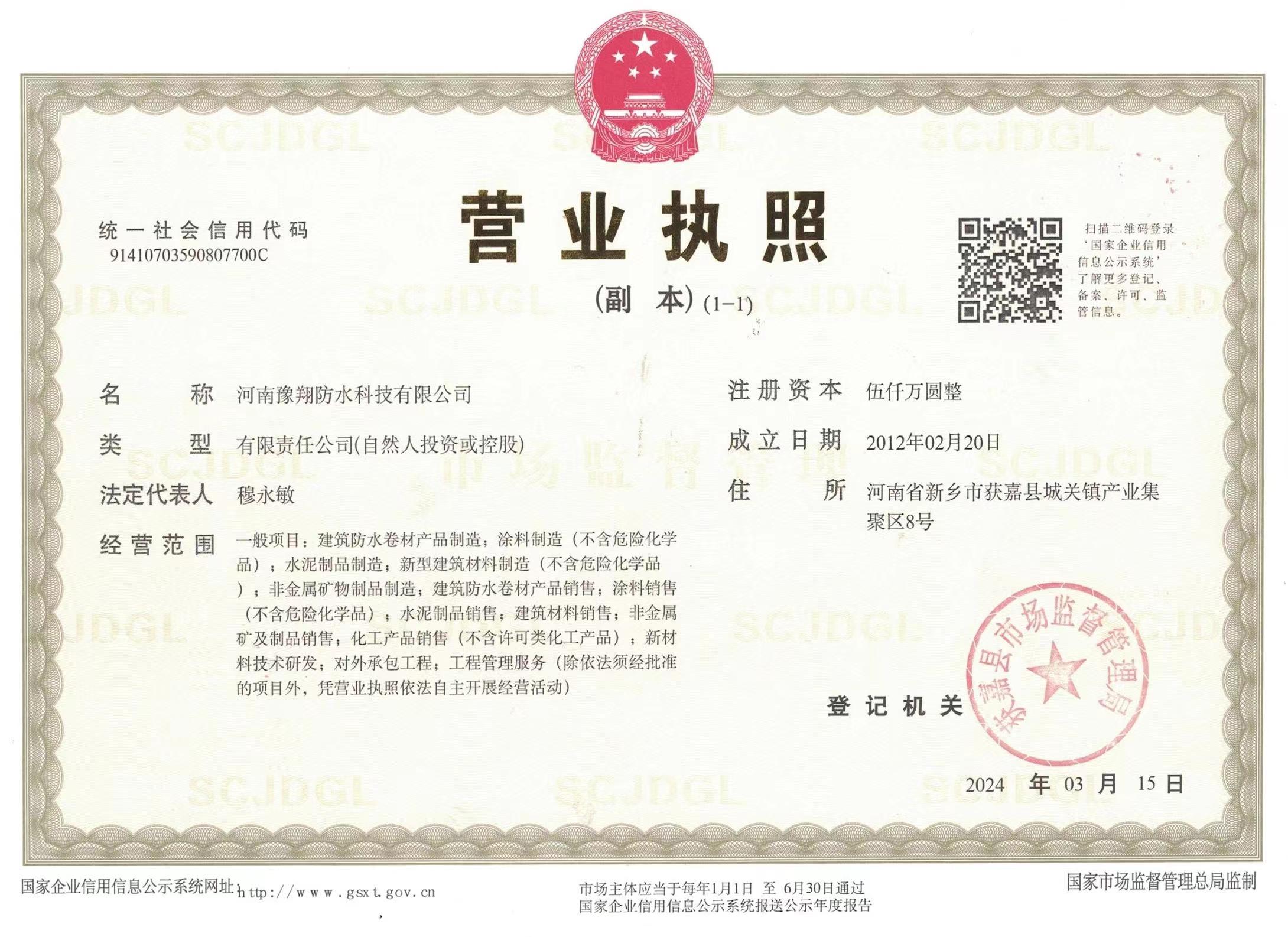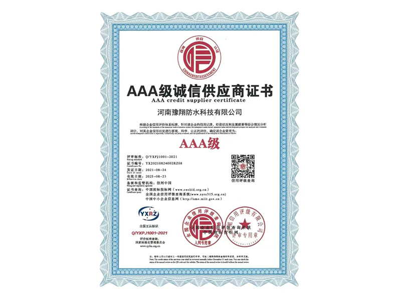 公司是中國建筑防水協(xié)會(huì)會(huì)員單位、河南省建筑防水協(xié)會(huì)會(huì)員單位、中國中鐵建筑CRCC認(rèn)證合作單位、中國中輕產(chǎn)品質(zhì)量保障CQGC認(rèn)證單位、國家康居示范工程產(chǎn)品單位、中國綠色環(huán)保家裝產(chǎn)品推廣單位、全國道橋高分子防水涂料國家標(biāo)準(zhǔn)參編單位,連續(xù)多年被評為“中國3.15誠信企業(yè)”、河南省“守合同重信用企業(yè)”。